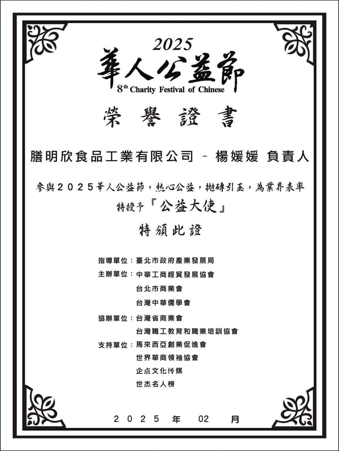 膳明欣食品工業有限公司 榮獲「公益大使」殊榮,感謝 2025年華人公益節 主辦單位的肯定與支持!