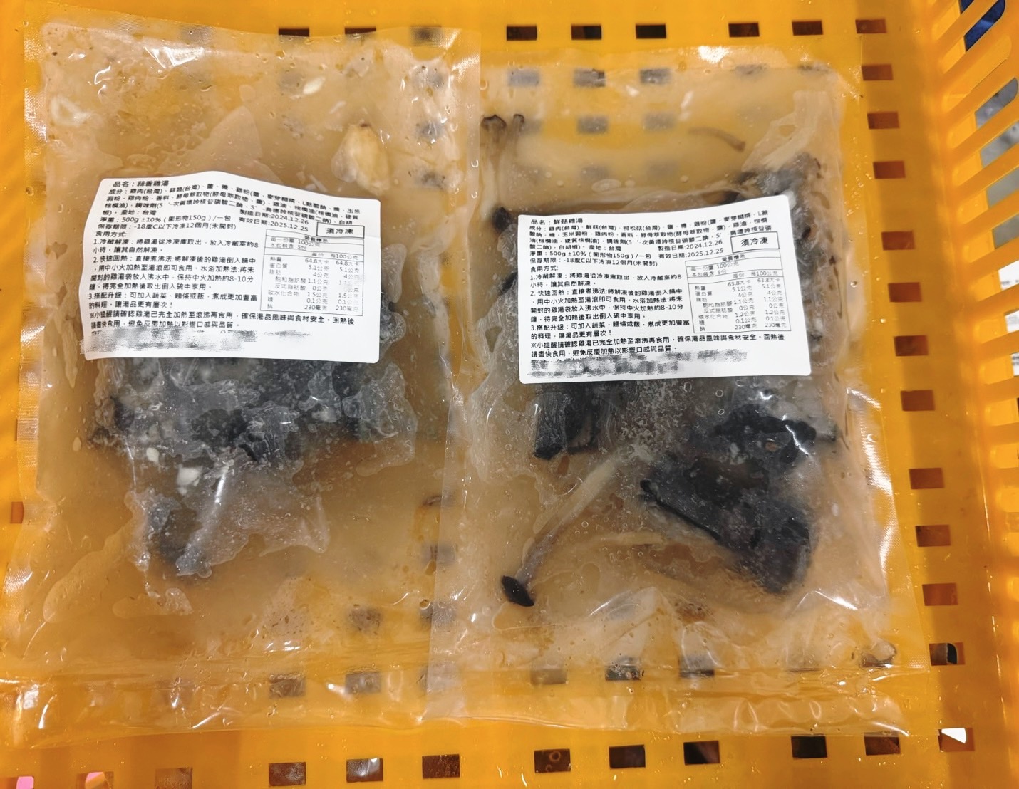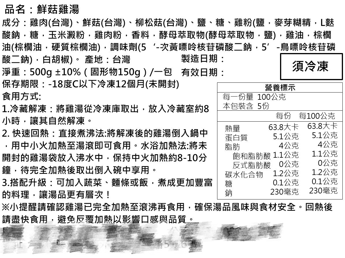 鮮菇雞湯:雞肉(台灣)、鮮菇(台灣)、柳松菇(台灣)、鹽、糖、天然香料。(詳情展開見食品標)