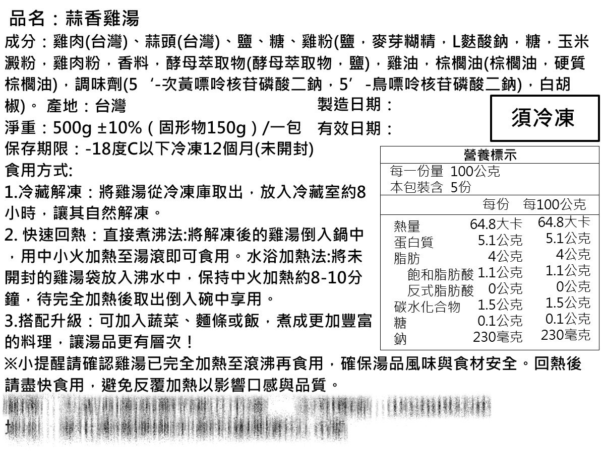 蒜香雞湯:雞肉(台灣)、蒜頭(台灣)、雞湯底、鹽、糖、天然香料。(詳情展開見食品標)