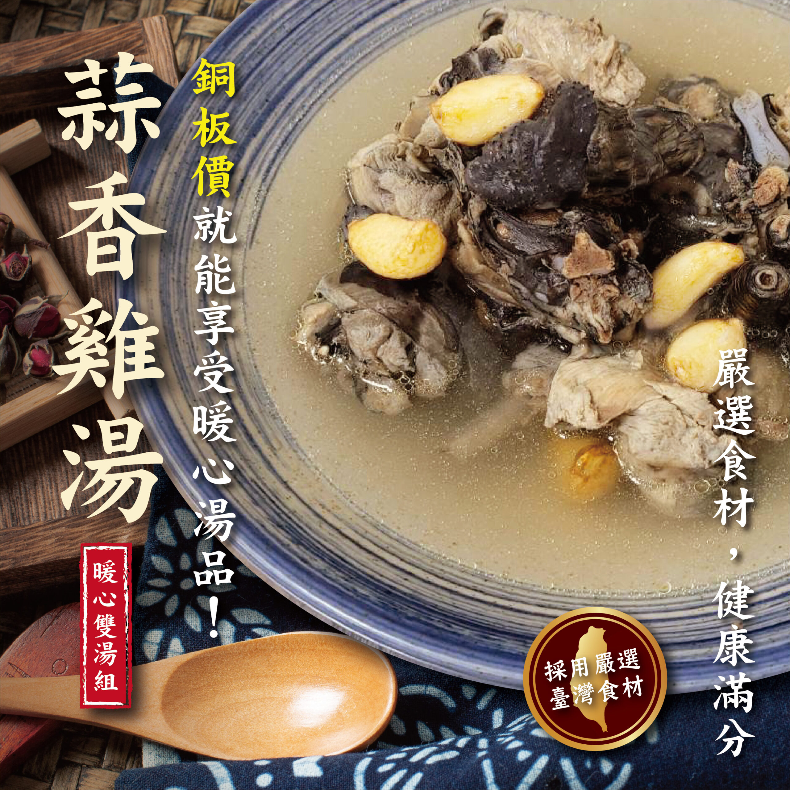 - 蒜香雞湯:滿滿台灣蒜頭與雞肉的絕佳搭配,濃郁蒜香直達心底,暖胃又提振精神!