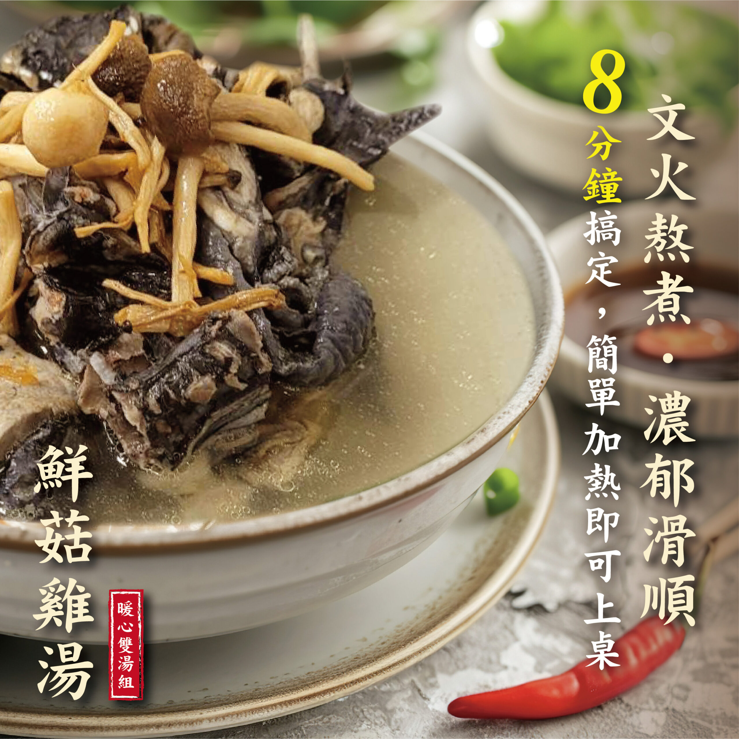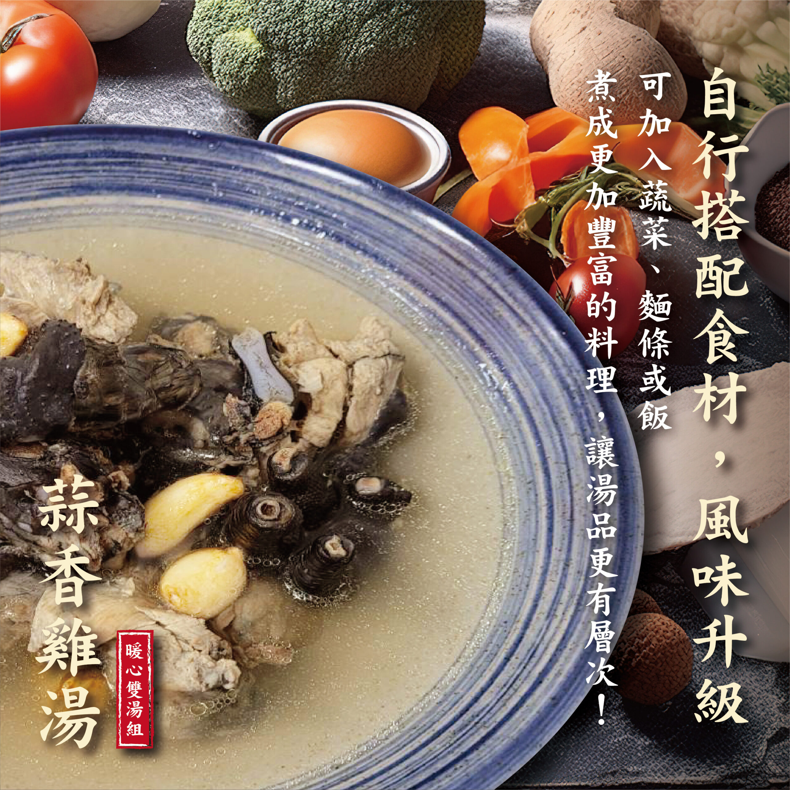 特別推出蒜香雞湯與鮮菇雞湯,兩款經典口味任您挑選,每一口都喝出健康與幸福!