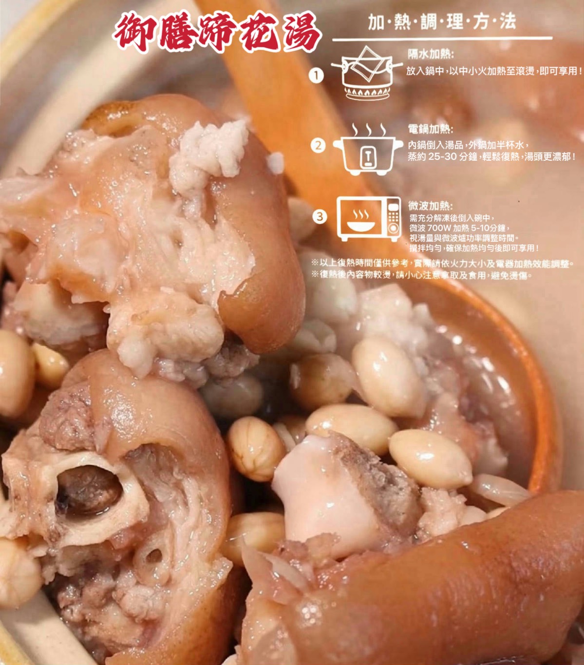 ,醇厚鮮美,融合豬腳的精華,喝完唇齒間還帶有自然膠質的黏滑感!
