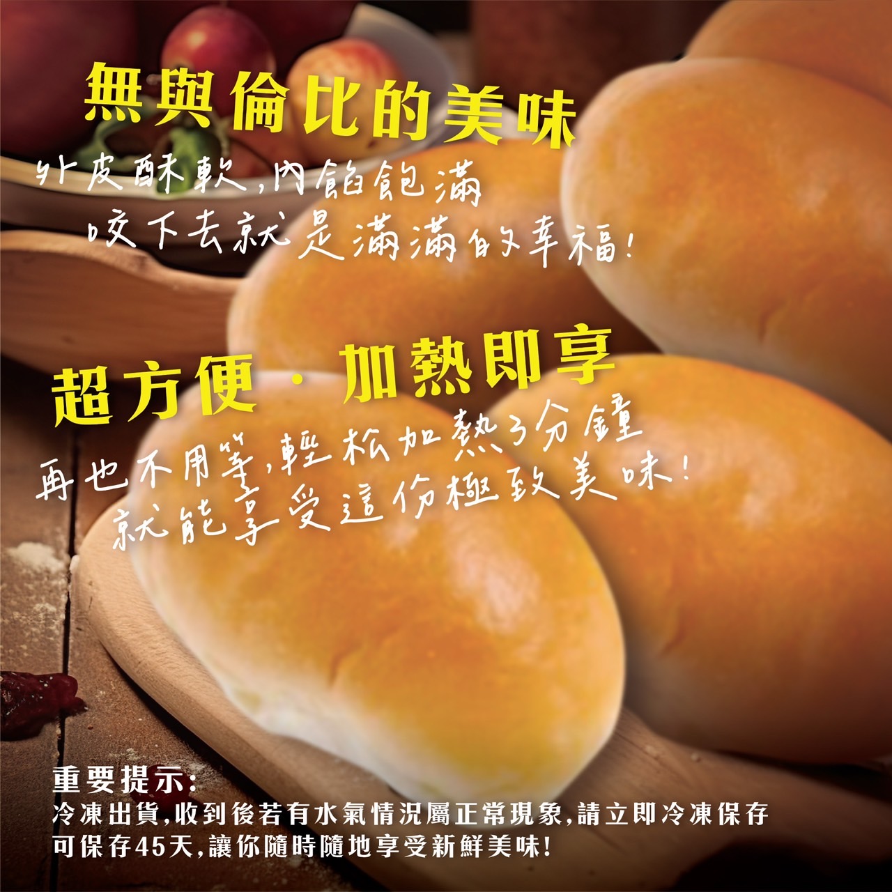 - 使用方式: 1.冷凍退冰 15 分鐘後,視烤箱溫度烤 2-3 分鐘,表面微焦最佳!2. 無需解凍微波小火一分鐘即可享用美味餐包
