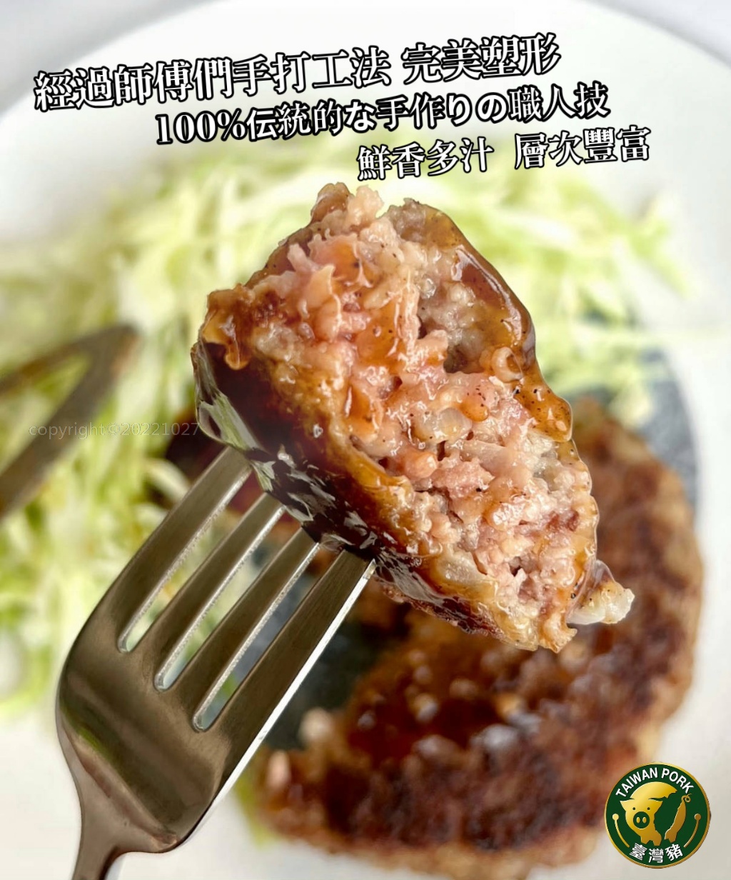 選用台灣溫體豬前腿肉,加入紅蘿蔔、洋蔥等蔬野食材,搭配特調醃料手打製成。